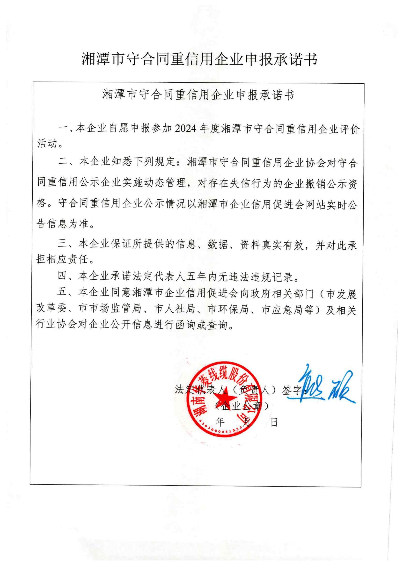 本企業(yè)根據(jù)《湘潭市守合同重信用企業(yè)申報(bào)規(guī)定》等編制 2024 年度企業(yè)信用報(bào)告書,并保證本報(bào)告書內(nèi)容真實(shí)、準(zhǔn)確、完整。