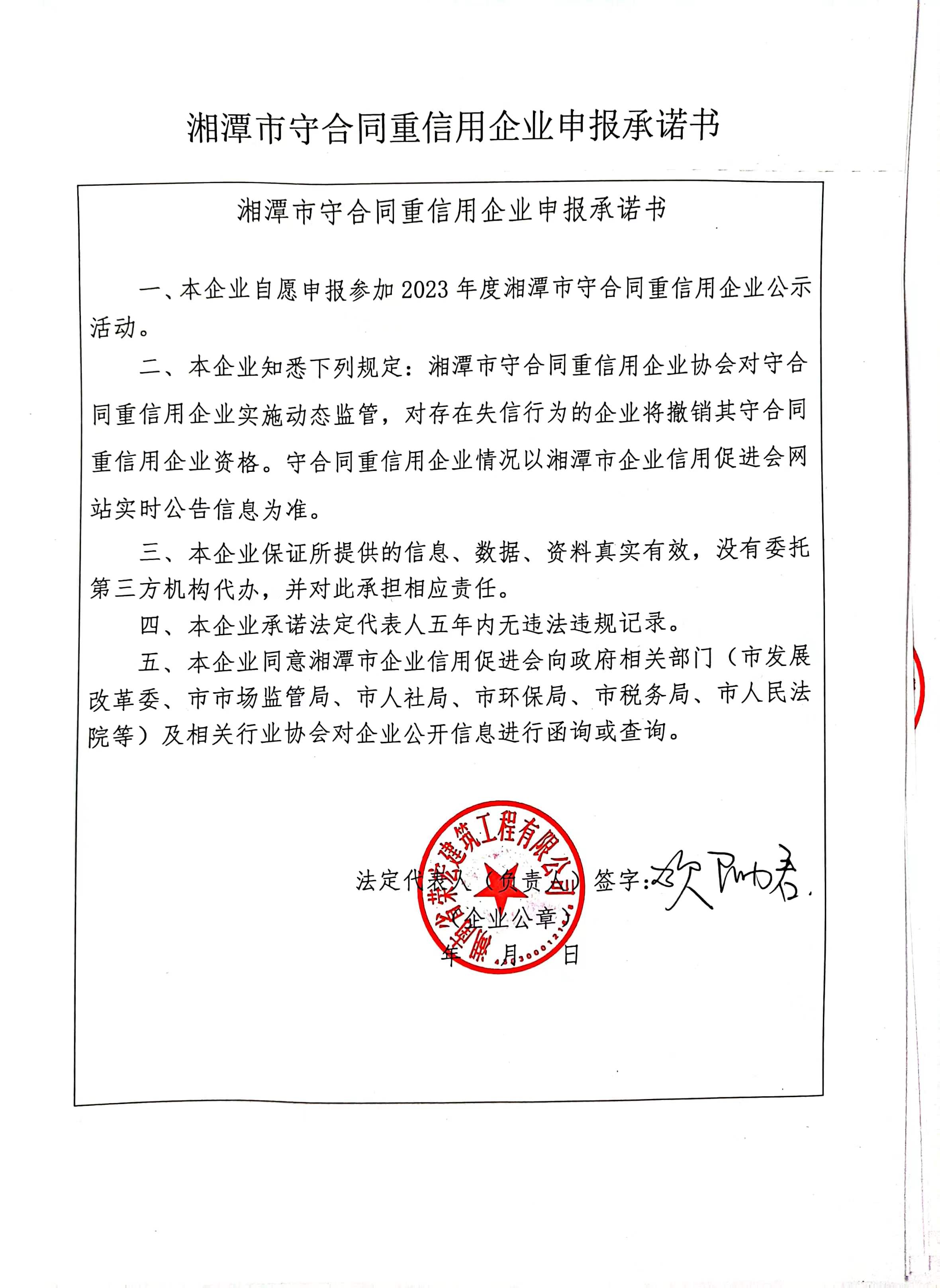 本企業(yè)根據(jù)《湘潭市守合同重信用企業(yè)申報(bào)規(guī)定》等編制 2023 年度企業(yè)信用報(bào)告書,并保證本報(bào)告書內(nèi)容真實(shí)、準(zhǔn)確、完整。