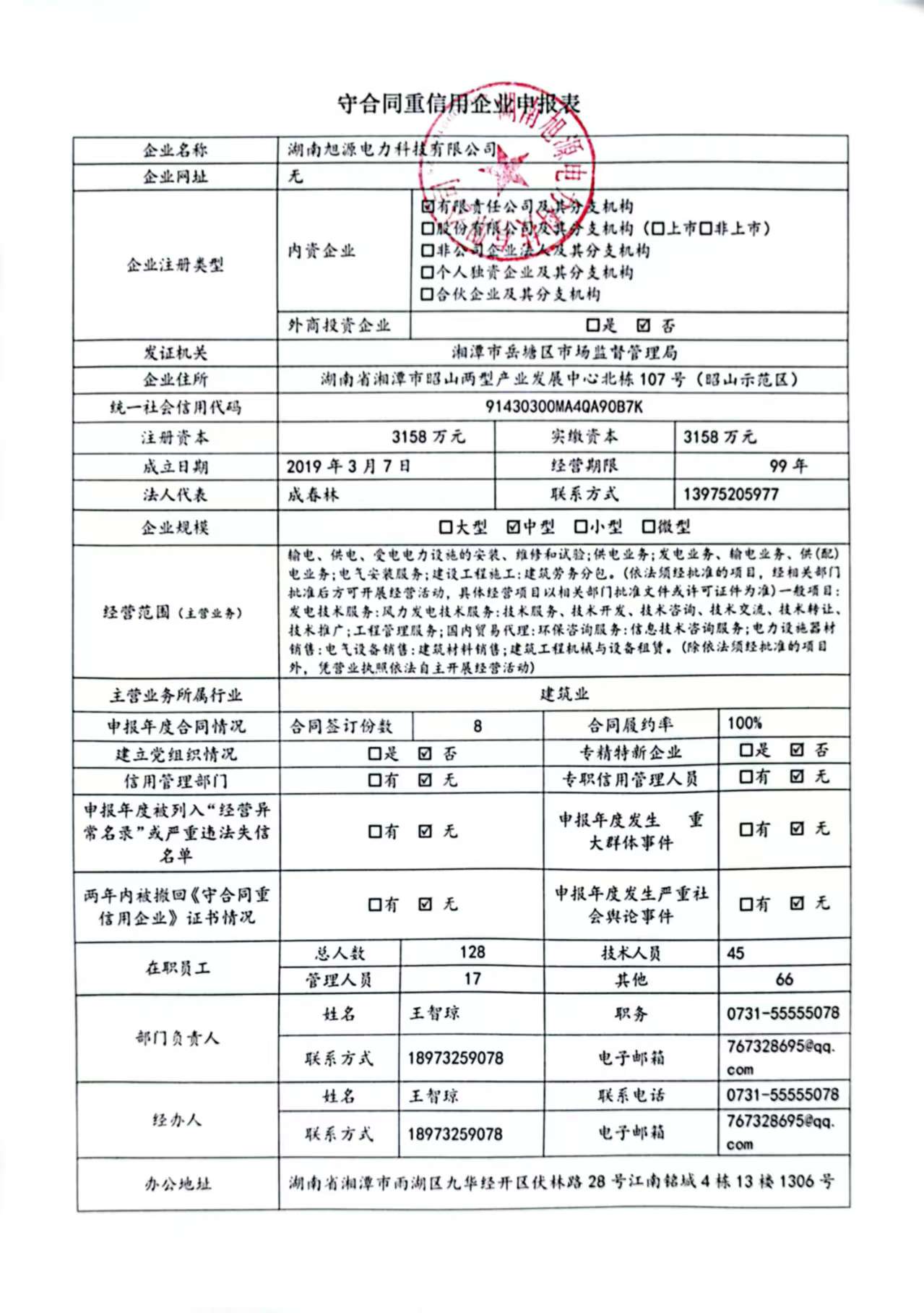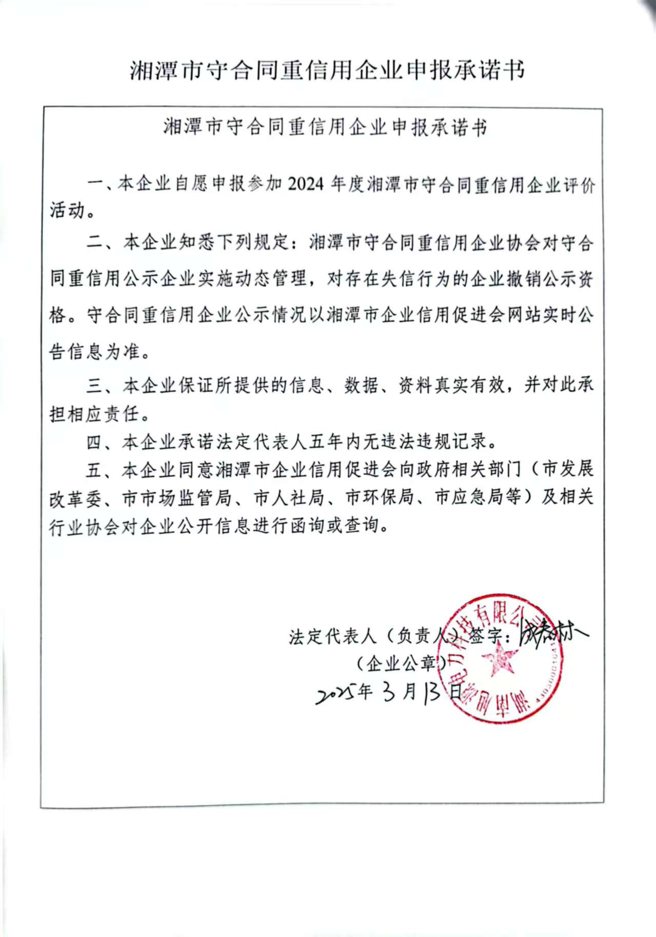 本企業(yè)根據(jù)《湘潭市守合同重信用企業(yè)申報規(guī)定》等編制 2024 年度企業(yè)信用報告書,并保證本報告書內容真實、準確、完整。