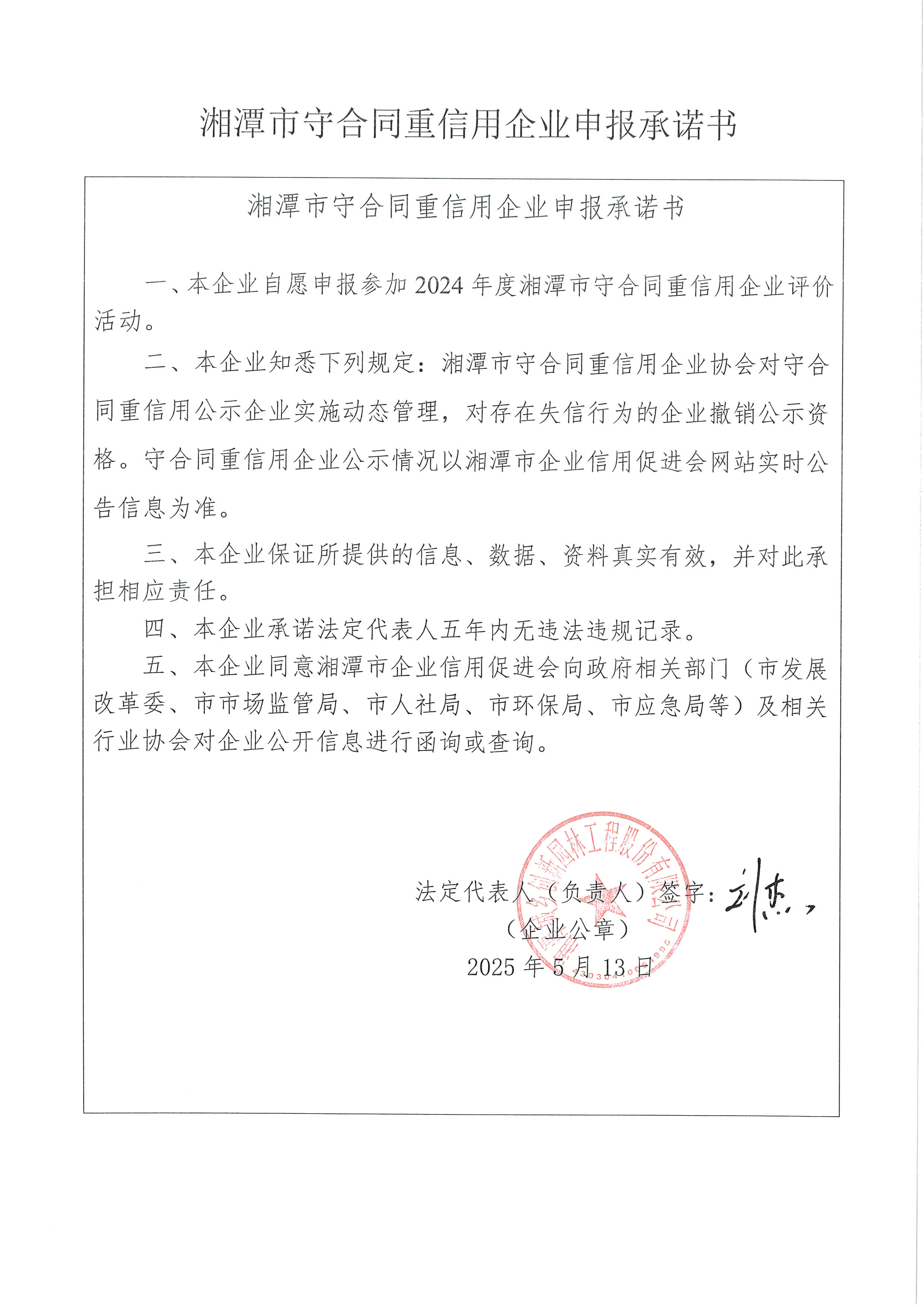 本企業(yè)根據(jù)《湘潭市守合同重信用企業(yè)申報規(guī)定》等編制 2024 年度企業(yè)信用報告書,并保證本報告書內(nèi)容真實、準確、完整。