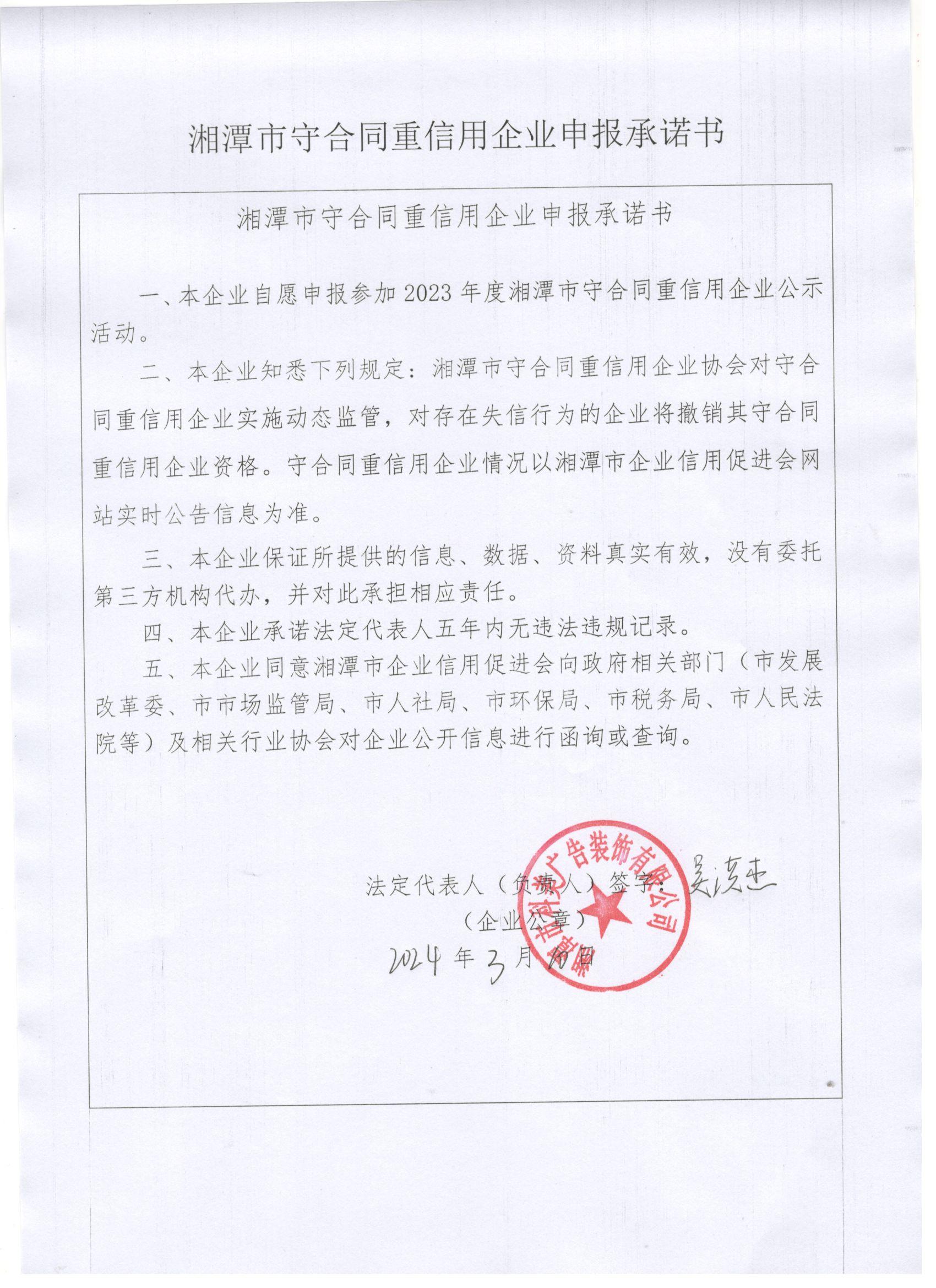 本企業(yè)根據(jù)《湘潭市守合同重信用企業(yè)申報(bào)規(guī)定》等編制 2023 年度企業(yè)信用報(bào)告書,并保證本報(bào)告書內(nèi)容真實(shí)、準(zhǔn)確、完整。